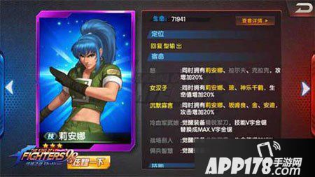 《拳皇98终极之战OL》莉安娜在之前的版本,因为升星方面比较困难,所有一直默默无闻。但在如今的版本中,不仅强化了莉安娜的资质及技能方面,同时也使升星方面不再困难,她将依靠强力的输出和治疗效果“V舞”崛起。