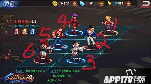 首先标准的六格内分成两排三列,按照游戏试图内格斗家为标准,格斗家横向的为排,格斗家纵向的为列,这点请大家不要弄混,第一排从上到下为一号位、二号位、三号位;第二排从上到下为四号位、五号位、六号位。