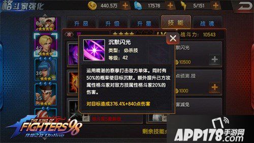 沉默闪光:运用精湛的泰拳攻击敌人同时有百分之50的概率沉默对方,增加己方攻属性格斗家对技属性格斗家百分之20的伤害(争霸赛中神一般的技能,高沉默,提升对技属性格斗家,弥补自身伤害不足的缺点,不论在什么模式什么玩法都是技属性格斗家的噩梦,也是 《拳皇98终极之战OL》中几率最高的单体沉默,只要不是脸黑,都可以让被击中的敌人两回合无法放出必杀技)