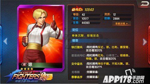 而社团战宝箱可以兑换炎之克里斯这位堪比14资质的格斗家,而女性格斗家数量本身就少,与其培养不知火舞这种送怒狂人,不如分一点资源给琼,来提升自己女性格斗家这一项的战斗力。而琼资质确实是硬伤,所以前期可培养,后期转入替补用来专攻争霸赛和社团战。小编的推荐就到此,愿各位玩家都喜欢这位女汉子。