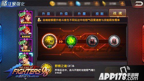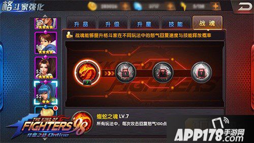 在这里额外提一个格斗家,八神。八神是一个很变态的格斗家,如果和其他人一起在第五轮开大招,战魂有6级就够了。但是社长建议大家把八神的战魂点满,因为这样的话八神可以提前几轮放出大招,而他的大招有一个很变态的效果,可以吸取经验贩卖机的防御力,这样后边的人输出会高很多。虽然看起来吸收了百分之二十,但是提升却不止这些,爆击率都有相应的增加。
