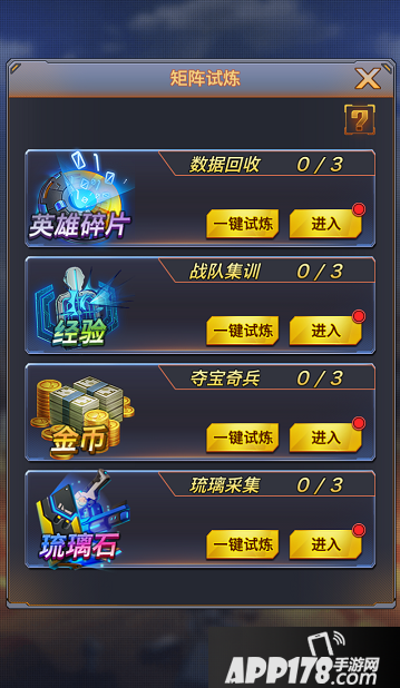 矩阵试炼,可以说是福利专区。在这里,可以领英雄碎片,经验,大量金币,和升级副官的琉璃石。