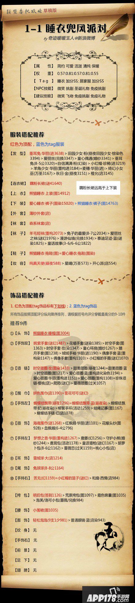 奇迹暖暖【新版联盟委托攻略-草稿版】由于目前都卡在第一关,所以先更新了1-1睡衣兜风派对。权重和以前相比稍有调整,不过服饰顺序基本未变(此次权重及tag测量全部使用IP教的方法,错了请找他)所有新联盟攻略将随关卡更新,后续会统一整理