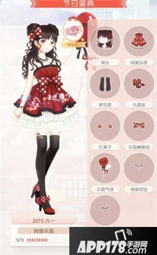 套装部件包含:发型(绮乐)、连衣裙(绮丽乐园)、袜子(梦恋园)、鞋子(乐园夜)、耳饰(红果子)、头饰(乐园蝴蝶结)、手持物(乐园气球)、颈饰(绮丽项链)、手饰(绮丽手链)