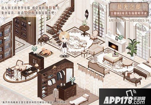 5月10日5:00—5月23日23:59,罗伊斯宅邸“晨光之邸”将限时开启小屋阁&家具专场,集齐所有主题家具,可解锁小屋客人——罗伊斯!