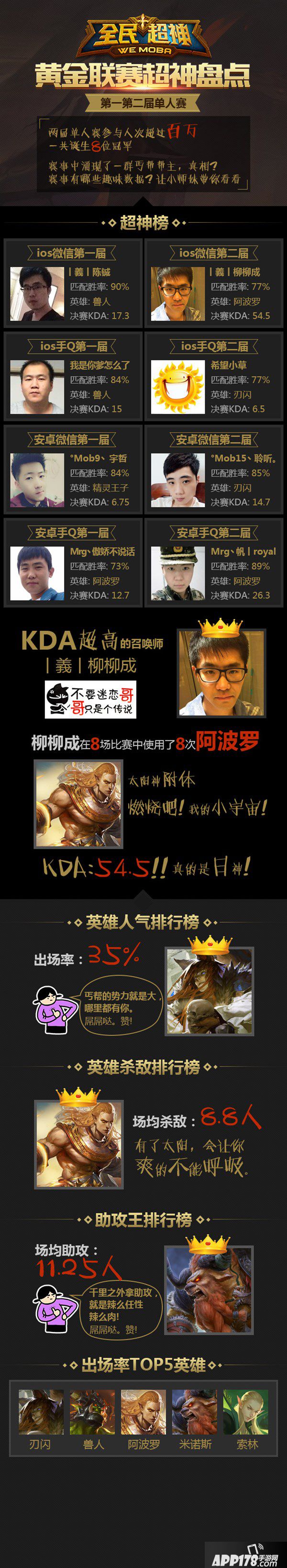 全民超神明星玩家介绍,第三届黄金双周单人赛复赛正在如火如荼的进行当中,全新赛制诱人奖池,错过了初赛的小伙伴们现在还可以直接购买复赛门票报名参赛,赢取三万钻石大奖!另外,进入决赛的召唤师可以共同分享千万钻石大奖哦!而在已经落下帷幕的第一届、第二届黄金双周赛中,却有一些足以亮瞎我们双眼的数据,比如人气王剑魔在顶尖大神手中拥有35%的出场率;而单人KDA((击杀数+助攻数)/死亡数)最高的柳柳成童鞋,他的8场太阳神KDA达到了恐怖的54.5;助攻王牛头人之神的场均助攻达到令人咂舌的11.25个等等等等!想了解上两届黄金双周赛的详细战况,想一览大神们的帅气面容,那就随小编来看看下图吧!