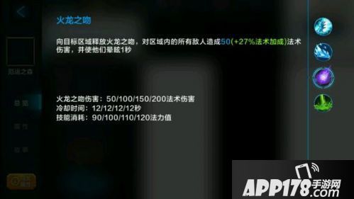 火龙之吻:区域目标释放火龙之吻,对区域内的所有敌人造成魔法伤害,并使他们眩晕1秒。