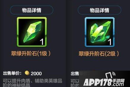 此外,不同类型的英雄所需要的升阶材料也是不一样的,如战士类英雄升阶材料为火红升阶石、法师类英雄升阶材料为湛蓝升阶石、肉盾类英雄升阶材料为翠绿升阶石。与此同时,英雄品阶升级所需要的材料会随着品阶的提升而变得高级,如,肉盾类英雄绿色品阶升蓝色品阶需要翠绿升阶石一级,而蓝色升蓝色+1品阶则需要翠绿升阶石二级。