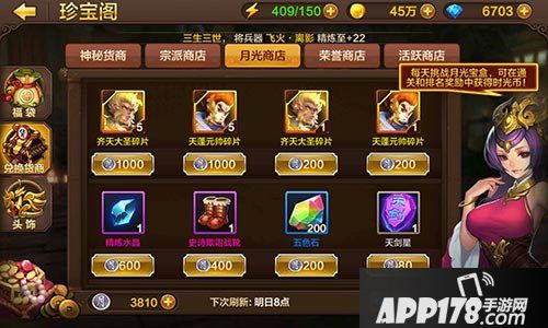 月光商店:消耗月光币,换取齐天大圣和天蓬元帅的碎片,月光币在月光宝盒中获取,难度比较大,获得多少关键还看自己的战力和技术了。