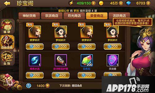 荣誉商店:和宗派商店一样,消耗的是荣誉币,换取修罗和罗刹的碎片,荣誉币可在斗技场中获得,获得难度还是很简单的!