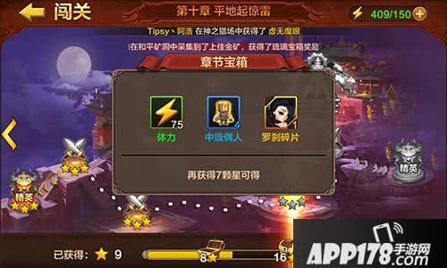 闯关:闯关绝对不是一个获取碎片的好方法,但是是我们必须要去收集的方法,没闯过一个章节,只要能打够足够的星级,就可以获得3个宝箱,这些宝箱中会有很多有72变碎片,但是数量并不多,玩家们在闯关的同时拿碎片,和乐而不为呢!
