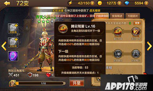 斗战:击中敌人可以积攒能量,,上限是50,随时间自动流失,没点能量增加攻击伤害,以及减少受到的伤害。随等级提升增长。