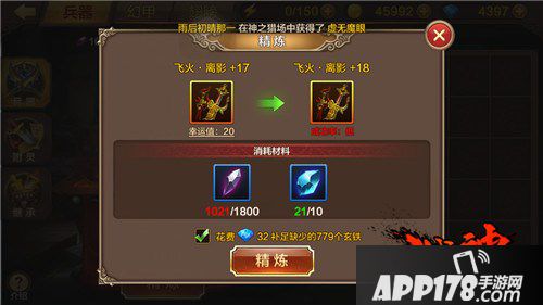 兵器精炼石提升战力最实在的方法,不过精炼需要很大的运气成分。这里幸运值的说法虽然有一定道理单页不是绝对的,连上和连跪都是经常出现的,幸运值50以上上不去也是经常发生的。精炼不强求能上多少是多少,20左右就足够了。