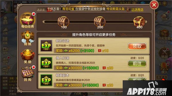 游戏中的每日任务也为玩家们提供了便利的升级方式。其不仅将《全民斗战神》中绝大部分玩法以任务的形式呈现在玩家面前,以便玩家逐个体验。当玩家完成该任务后,还能获得大量经验值和神秘物品奖励。完成每日任务还能奖励给玩家一定数额的活跃度。当玩家的活跃度达到100、200、400时,就会开启活跃度宝箱,活跃度越高,宝箱内含有的经验与活跃比就越多。活跃币主要用于活跃度商店,可兑换珍贵的齐天大圣碎片和种族天赋书等。