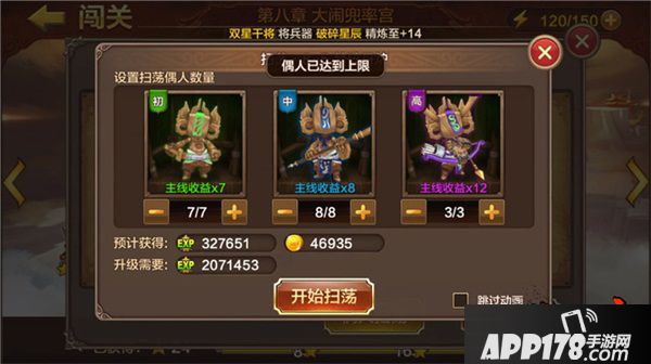 偶人扫荡是21级及以上的玩家最主要的升级手段。它可以让玩家跳过战斗环节,直接扫荡主线关卡获取经验值和装备奖励,且不消耗任何体力值。偶人亦分为三种品质,从低到高依次为初级偶人、中级偶人和高级偶人,分别提供7倍、8倍和12倍的经验收益。