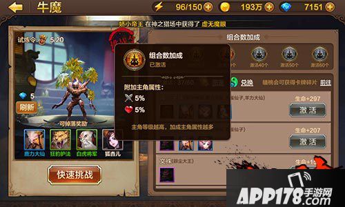 试炼中除了卡片组合可以获得属性加成外,还可以通过激活组合的数量来增加属性,每十个组合,就能激活一条属性,也就是说10、20、30、40、50、60个,都会得到加成,都是生命和攻击的加成!