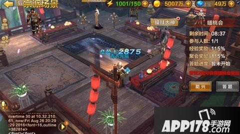 所有宗派成员相聚一堂,聊聊天,答答题,还能获得丰厚的奖励,你也来感受一下聚会的氛围吧!