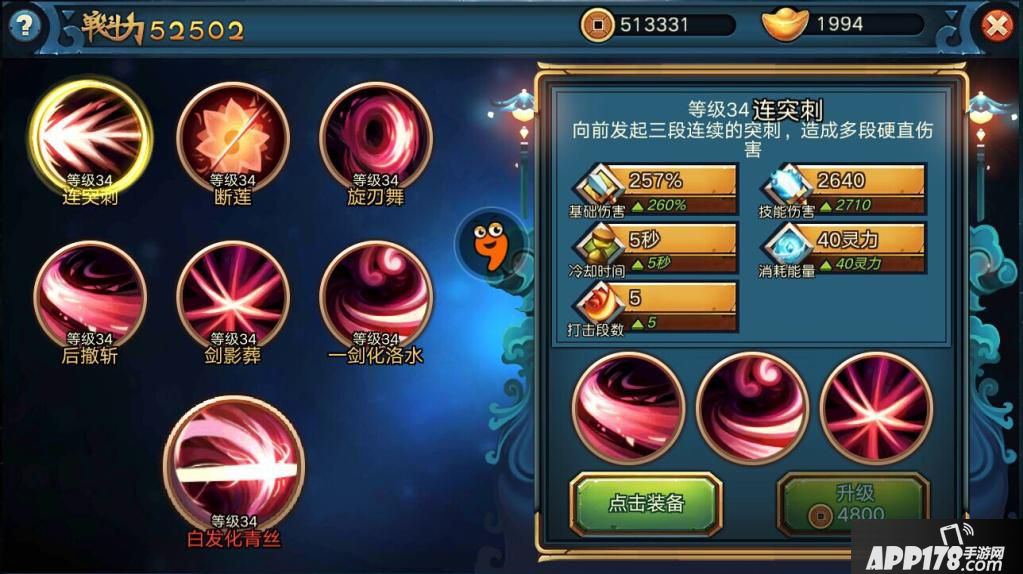 选择理由:比较帅气的技能,如用万剑齐发,站桩技能,轻小怪作用还是很大的,大怪有点不灵活,非霸体状态也可,只不过相比灵力消耗,有点不划算。缺点就是耗费灵力较多。