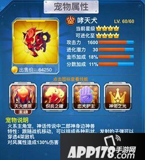 哮天犬主动技伤害有100万之多,并且在发动时主机也能继续输出。这是哮天犬主动技的一大优势,即使同级宠物技能伤害比哮天犬高,但最终输出还是哮天犬更高,因为其余宠物的技能释放时主机是停止输出的。而技能“炽炎之瞳”的稳定火力+5在战斗中的效果非常给力,可以输出更多的伤害,那么在这两方面的判断下,在战机方面,单双打模式小编都推荐搭配当前输出最高的战机——葫芦小金刚,最能发挥哮天犬技能的优势。葫芦小金刚攻击力是目前战机中的顶峰,加之有技能“紫色葫芦”这一优秀续航技能恢复生命和护体,让其有了极好的输出环境。