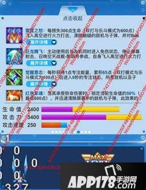 【雷霆之怒】:每损失300点生命(双打与乐斗模式为600点),飞入高空进行火力打击,清除触碰的敌机与子弹,并对Boss或首领造成每秒265000点伤害,持续9秒,释放期间战机免伤。技能开始和结束时均造成清屏爆炸,累积最高造成2940000点伤害(乐斗模式下,持续时间与伤害减半)