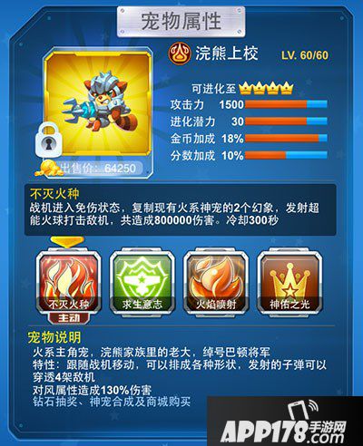 在宠物特性与主动技能上浣熊上校和浣熊军士非常相似,都拥有穿透子弹,能根据战机移动来排成各式形状来配合输出。而主动技能更为逆天,伤害远超浣熊军士,熊熊燃烧的弹炎堪比战机弹道。击杀敌机也更轻易,配合“求生意志”抵御致死伤害,续航能力大大提升。
