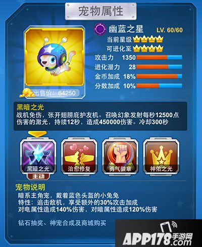 幽蓝之星在皇冠宠之中独具人气与其面面俱到的技能设置息息相关。而在追击敌机时,它还可享受30%的攻击加成,攻击效果对电属性、暗属性敌机尤为显著,是值得收入并培养至满级的强力宠物。