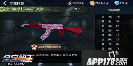 既然是AK47的改进版,那么小编来带大家看看圣诞究竟比普通AK好在哪里。从属性上看,圣诞的精准度、换弹以及载弹都有了一定的提升,其中,精准对于AK系列的枪尤为重要,因为其后坐力大。这样来看,这把枪还是不错的,便宜又不失其威力,可以考虑哦!