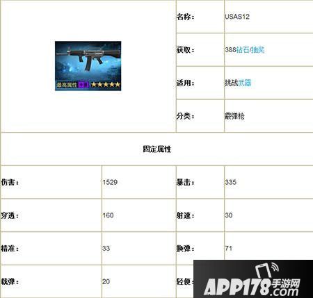全民枪王USAS12怎么样,USAS12属性介绍。在游戏中USAS12怎么样了?散弹枪USAS12好不好这把也是五星级枪,那么到底如何了?下面小编就为大家介绍其属性。