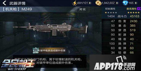 虽然这把枪比较次一些,比不上迷彩M249,但初始战力也仅仅差200,达到了1400多,这点到是正常,毕竟都是机关枪,没有种类上的差别,所以和神器M249-迷彩的差距也仅是培养时的属性加成上,所以对于前期的你们选择这把枪,并不会吃多大的亏。