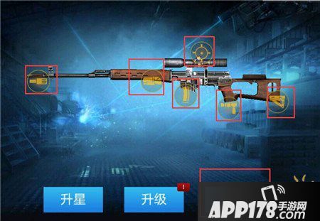2、进入武器页面后,如果你没有收集全零件,就只会显示升星和升级两个标签,这时候你要做的,就是收集零件,枪身零件如下图红框位置,这个过程很简单,只要扫荡零件掉落的副本就可以了,当收集全零件,就会出现进阶标签(如下图)。
