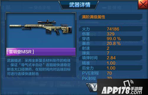 雷明登MSR最大的优势就是极高的伤害和射速,329的伤害配合上2点的射速可轻松给敌人造成巨大的伤害,优秀的弹夹容量和填弹时间也是雷明登MSR的一大优势。