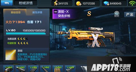 一把配件达到50级的激能伤害仅为171,在S级突击步枪里激能的伤害真的比其他枪械要低,但是激能的技能可以在PVP模式使用,不仅仅是10秒无限弹夹并且能提高25%的PVP伤害。