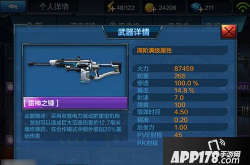 从图中我们可以看出满级的雷神之锤火力高达87459的,想想都有点可怕有木有呢?在枪械介绍中就能看出这把雷神之锤的霸气,机炮,并不是普通的机枪,发射的子弹是12.7的爆炸弹药,玩家即便没有射击到敌人,在爆炸范围内,也能对敌人造成溅射伤害。射速不高,伤害惊人,范围惊人,是这把机枪的最大特点。你值得购买。