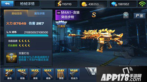 M4A1贪狼的面板伤害并不是最高的只有267,不过9.3的射速却是突击步枪最高的,贪狼是高射速突击步枪里伤害最高的一把,贪狼入手难度较大不过使用效果却是物超所值的,50级贪狼的伤害比65的QBZ97上海还要高就是最好的证明。