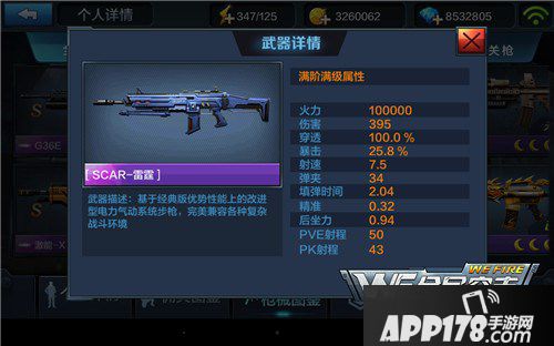 SCAR-雷霆测试枪械为320伤害没有达到满属性,不过伤害任然能达到700左右,在突击步枪里PVP能达到700的枪械仅此一把,C36E和SCAR-H只能达到600左右,高射速突击步枪伤害通常只有400,雷霆的伤害数值是非常高的。