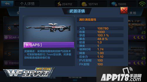 作为目前最顶级的狙击枪,长弓APS采用独特膛线和回转气动,可发射独有的12.7mm空尖弹,能够瞬间对敌人造成巨额的伤害,1.74的填弹时间和48.8%的暴击也都属于狙击枪中的顶尖水准。