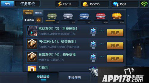 活跃度通过完成每日人物可以获得,通过任务系统可以逐个完成,每日活跃度上限为150,在达到30、60、90、120和150时可以领到不同的奖励,在60-120活跃度箱子里有在PVE里对上还有加成的芯片,每日活跃度到达120可以领到三个一级芯片,最后150活跃度宝箱为30钻石。