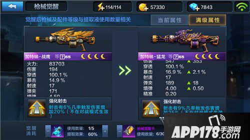 大多数玩家加特林战鹰都是60级或者65级,等级越高觉醒花费的提取液和觉醒卡就越多,当60级战鹰觉醒时就需要30张觉醒卡价值3000钻石,5瓶提取液也需要1200钻石,60级的紫色配件非常珍贵,除非手上有大量对于配件,否则不要节约提取液。