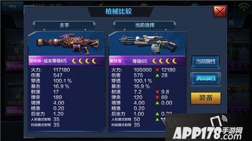 在火力上猛龙的属性已经超越了解放者,猛龙相对于战鹰加强了30%伤害,同样解放者伤害也比战鹰高出30%,在综合伤害上这两把枪基本没有差别。不过在输出机制上相差却较大,解放者靠爆炸伤害而猛龙靠射速和弹夹,如何选择还是根据个人喜好。