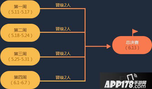 线上赛事分4周进行,每个参赛周内,根据报名玩家点击报名后至参赛周结束期间挑战模式分数的高低排名。排名最高的两个报名玩家获得晋级总 决赛资格。(已经获得晋级资格的玩家可以继续报名参加赛事,其排名可以获取排名奖励但不占用晋级名额)