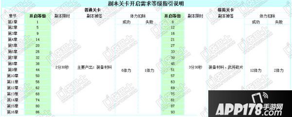 游戏中副本分为普通关卡和精英关卡,不通关卡开启的等级是不一样的,下面小编将普通关卡和精英关卡开启等级以及奖励为玩友们整理了表格,如图: