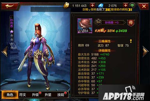 孙尚香的三围属性分别为:统帅69、武力87、智谋75,在紫将属性数值中等。