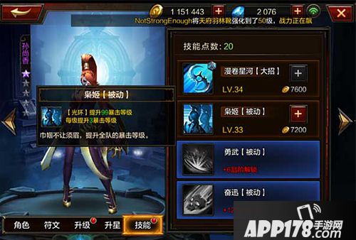 【被动】枭姬,巾帼不让须眉,提高全队暴击等级。【光环】提升暴击等级。每级提升3暴击等级。