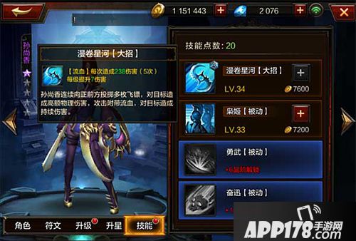 其中,征战闯关与千军破的要求皆是击败大量敌人。而孙尚香的普通攻击为左右挥击、360度斩击,可有效的快速打击敌人。大招【漫卷星河】更是对敌人多个目标进行输出,造成非常高的伤害,刷图效率很高。