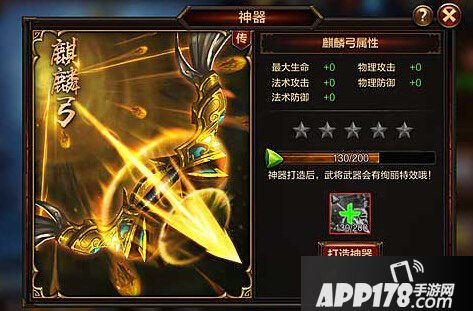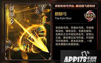 以上就是黄忠的专属神器麒麟弓的相关信息介绍,仅供参考,希望对大家有所帮助!更多精彩内容尽在APP178手游全民无双专区查看!