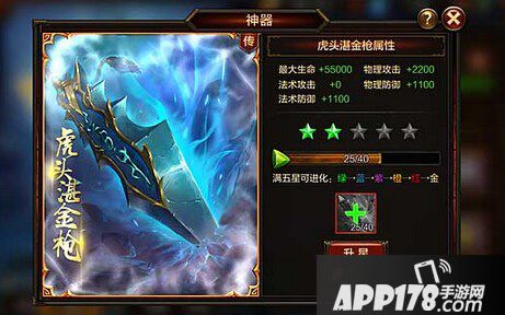 神器星级:神器一共6阶30星,每阶5星。由低到高分别为1星、2星、3星、4星、5星。消耗神器碎片可升星神器,每满5星即可进化到下一品阶:绿→蓝→紫→橙→红→金。