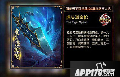 神器信息:虎头湛金枪枪身乃混铁精钢打造而成,长一丈一尺三,枪头为镏金虎头形,虎口吞刃,乃白金铸就,锋锐务必,三国名将,威震西凉,五虎上将之一,马超的掌中宝枪。