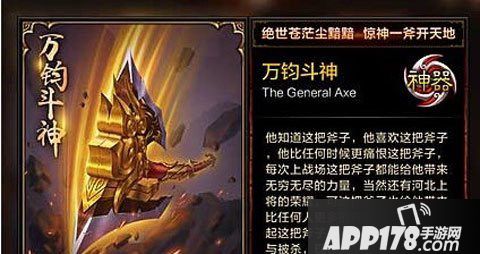 对于万钧斗神有一句话是这么说的那就是绝世苍茫尘黯黯,惊神一斧开天地,短短的二句完美的体现出了武将文丑的专属神器万钧斗神所具有的独有特色和杀伤力,是一股不容小视的力量,所以文丑非常喜爱它的神器,不管是杀敌还是做什么都会一直把它带在身边,每次都可以取得不错的战绩。