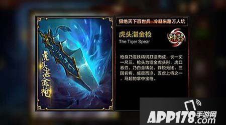 神器信息:虎头湛金枪枪身乃混铁精钢打造而成,长一丈一尺三,枪头为镏金虎头形,虎口吞刃,乃白金铸就,锋锐务必,三国名将,威震西凉,五虎上将之一,马超的掌中宝枪。