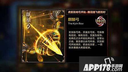 神器信息:麒麟弓为玄铁胎弓脊,天蚕丝弓弦,弓身雕有花纹,镶有宝石、玉器为装饰,无两石之力不能拉开辞工。定军山之战,黄忠曾以此弓作战,只见那弓开如满月,箭去似流星,一箭射杀曹魏大将夏侯渊。